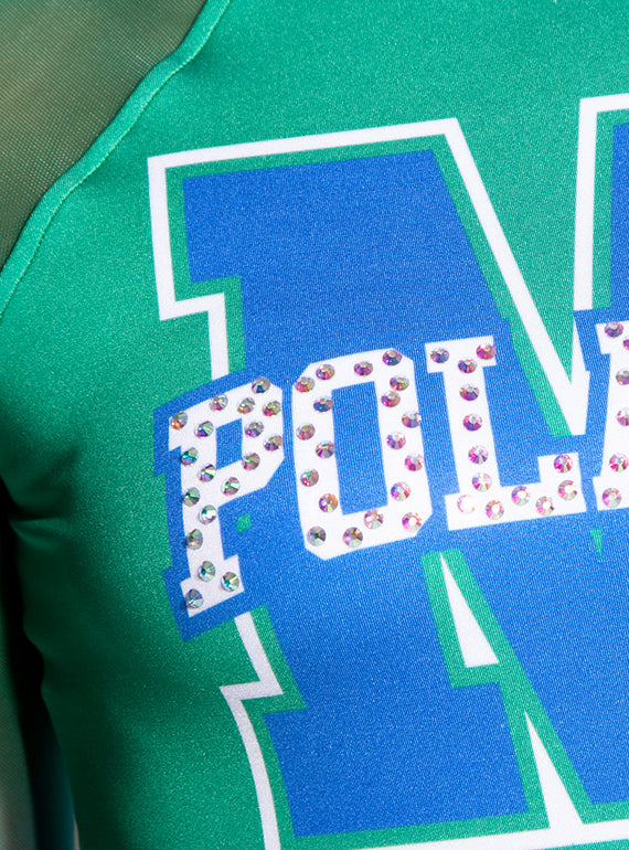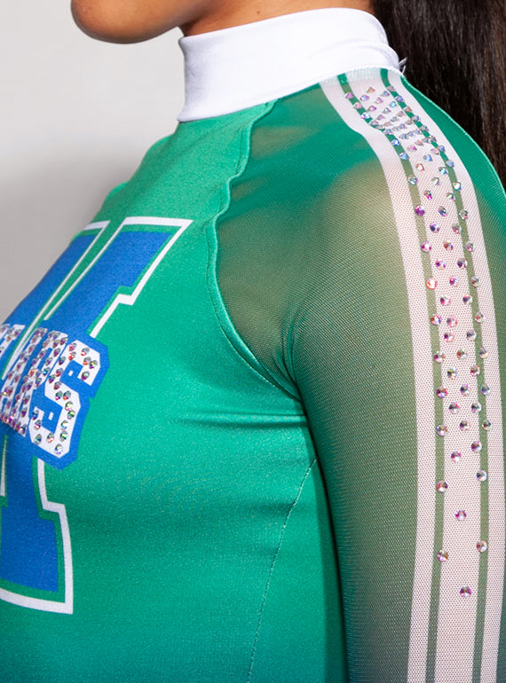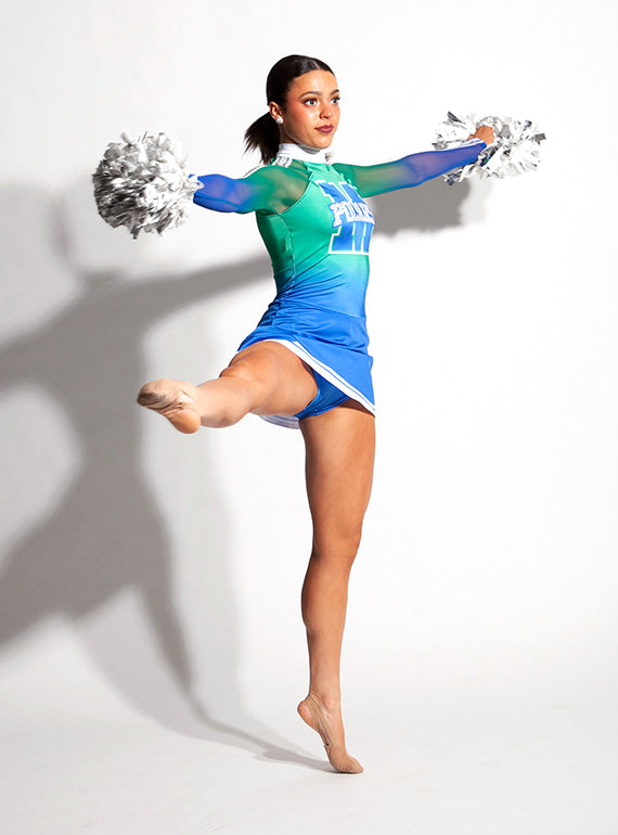 - Fully sublimated ombre gameday cheer dress with mesh sleeves, mock neck, and keyhole back