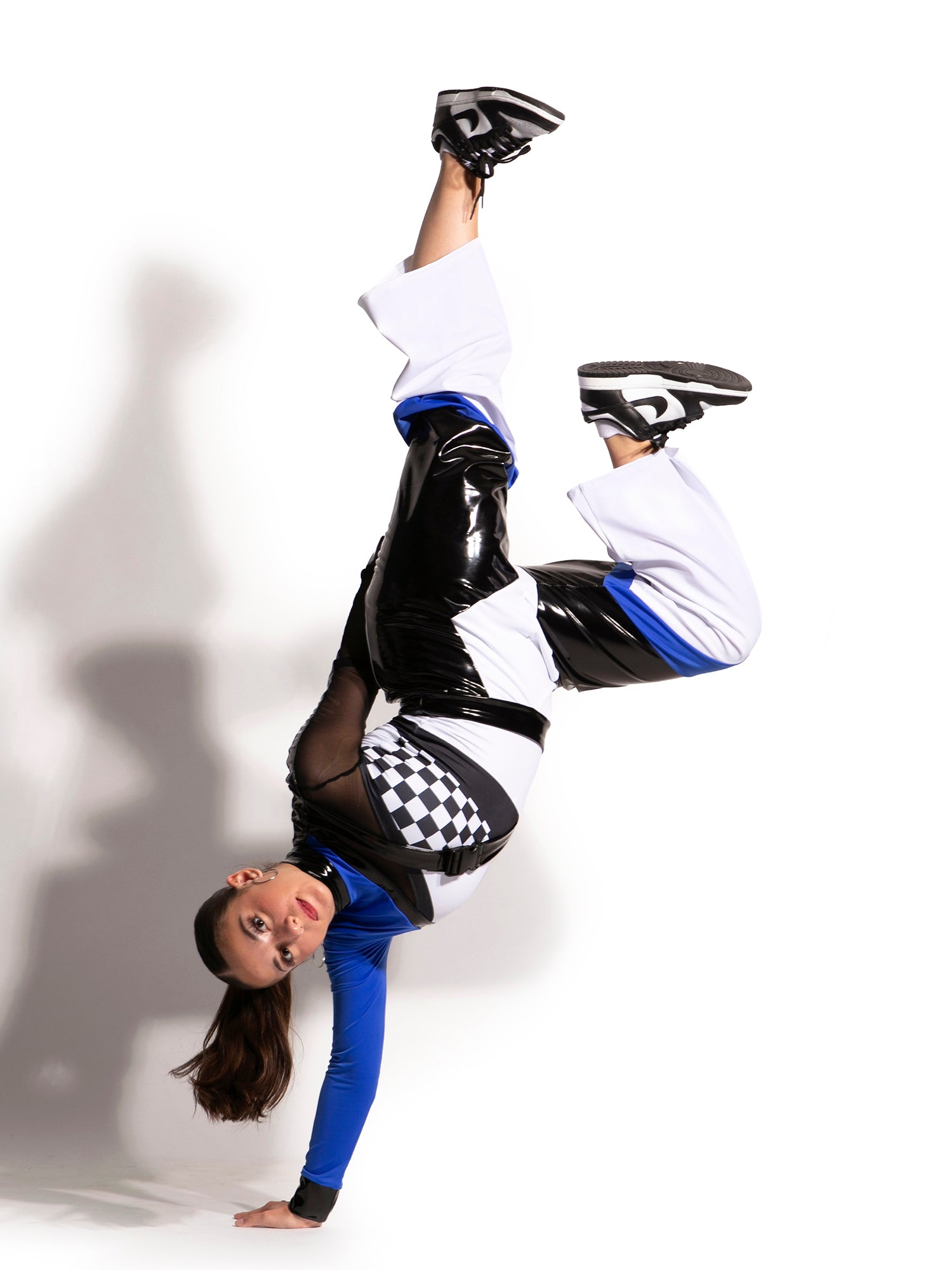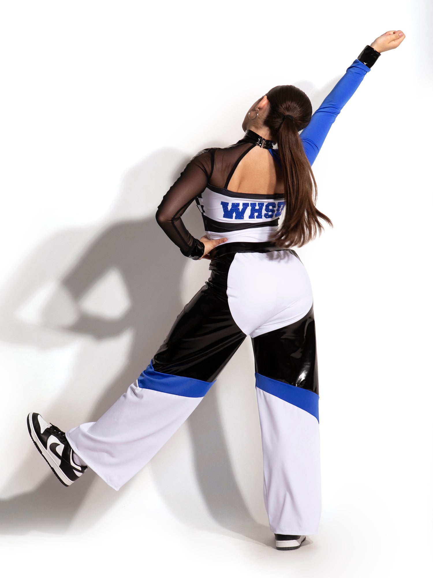 - F-1 inspired asymmetrical long sleeve leotard with liquid blocking, sublimated checker print and lettering