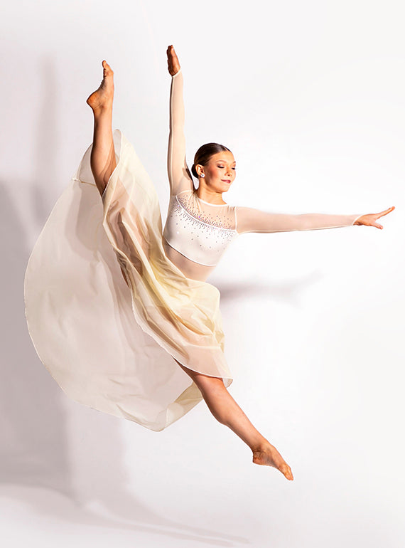 - Soft-flowing contemporary mesh dance dress with long sleeves and bandeau chest