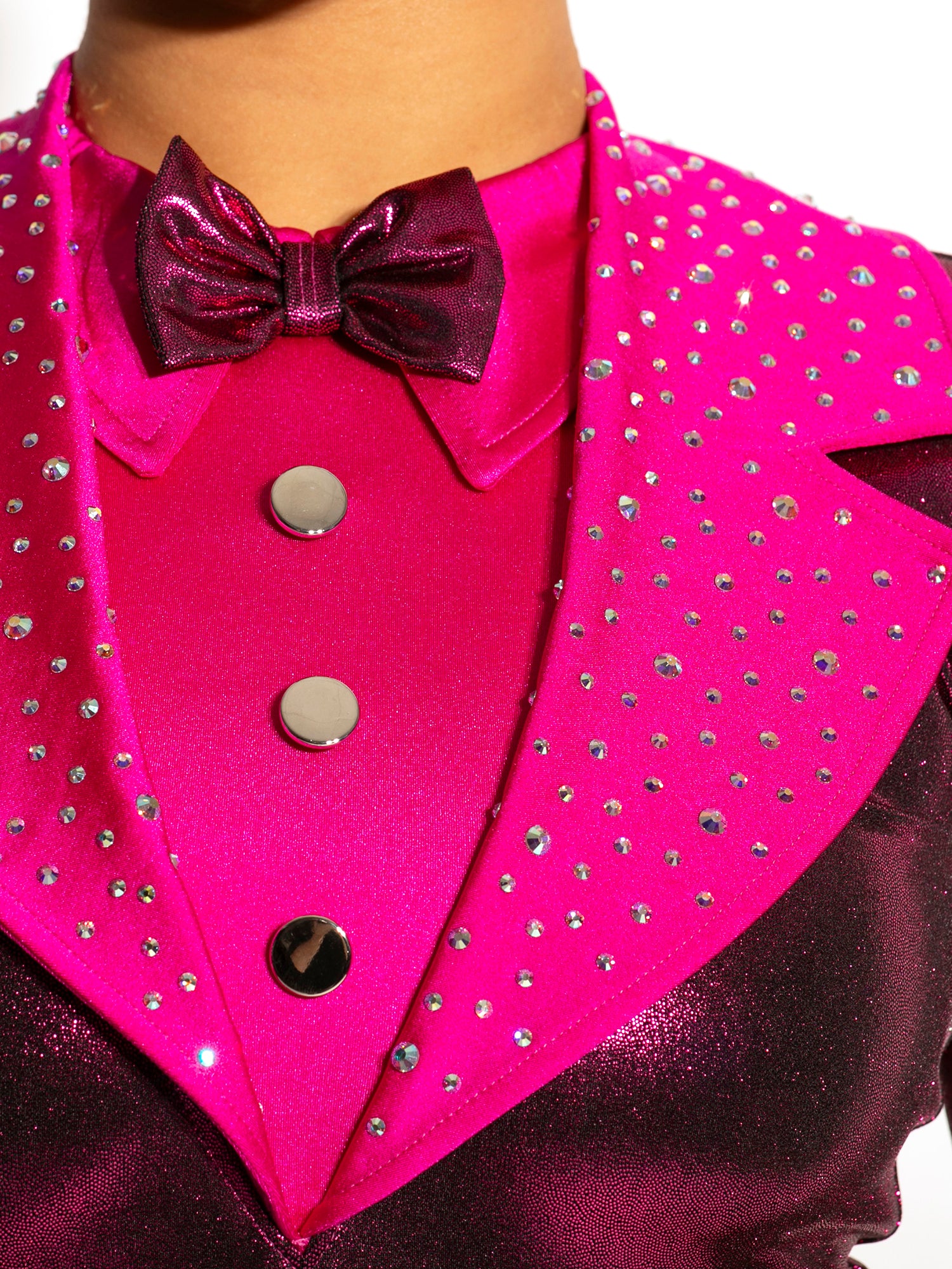- Long sleeve suit inspired leotard with an attached bow and add on rhinestones
