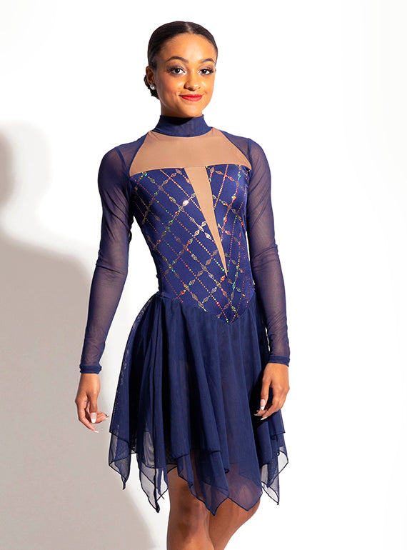 - Mock neck long sleeved dress with mesh inset and spangle design