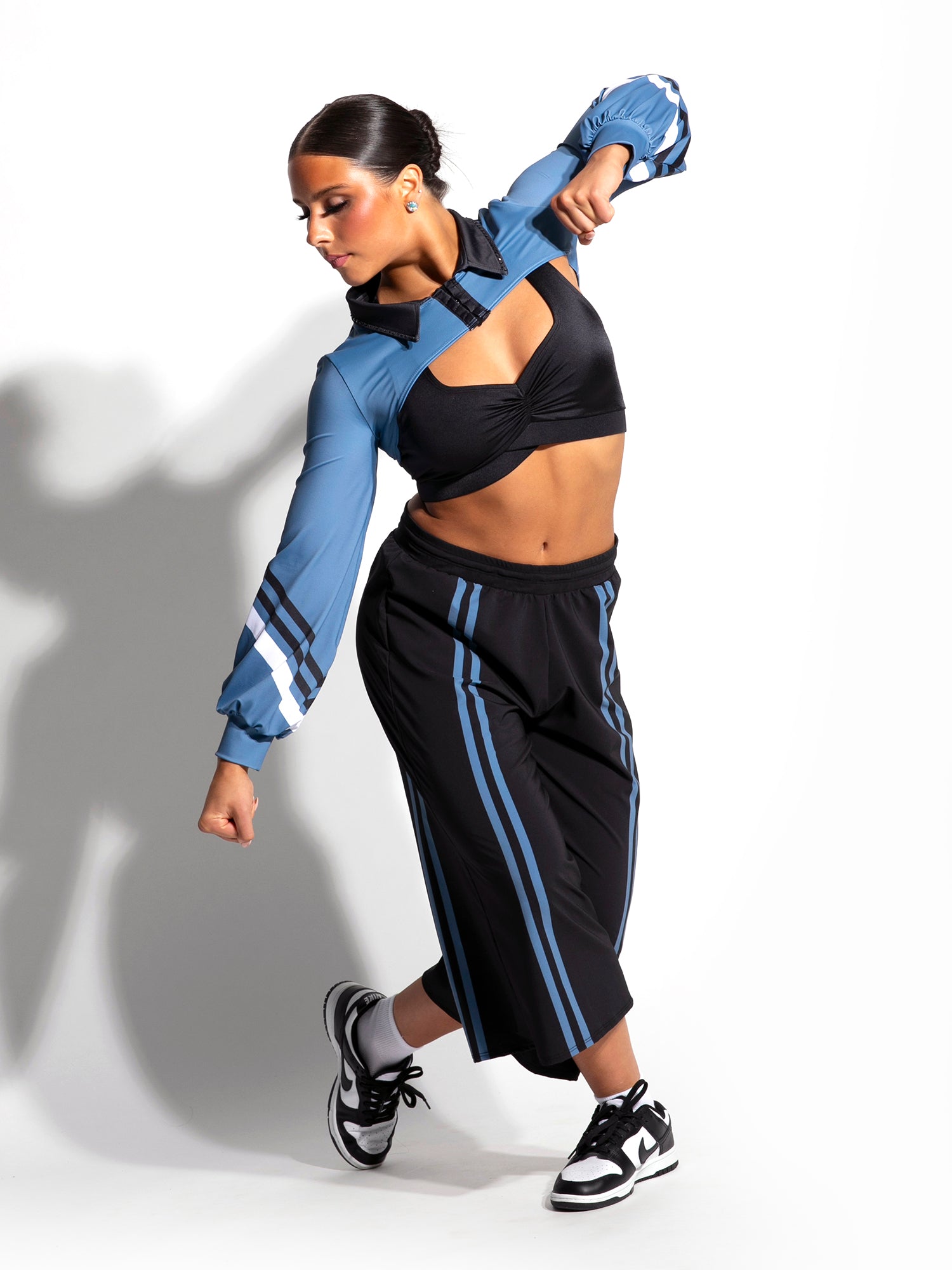 The Selma Bermuda Shorts by The Line Up are fun, fully sublimated wide-leg cropped pants featuring bold vertical stripes for a sporty, standout look. Designed for movement and style, they bring a fresh, modern edge to hip hop routines, warmups, and game day performances.