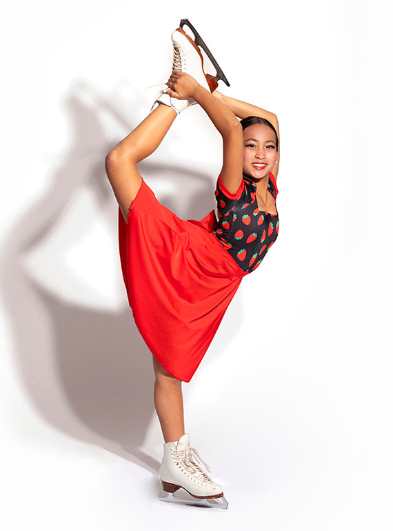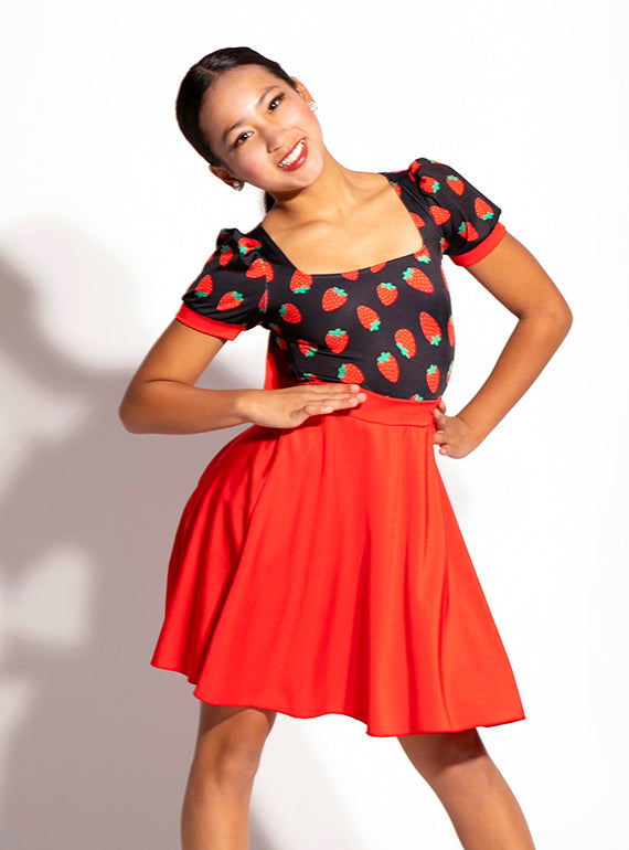 - Choose from one of our four background color options for the strawberry print on the bodice (strawberry colors are Crimson Red)