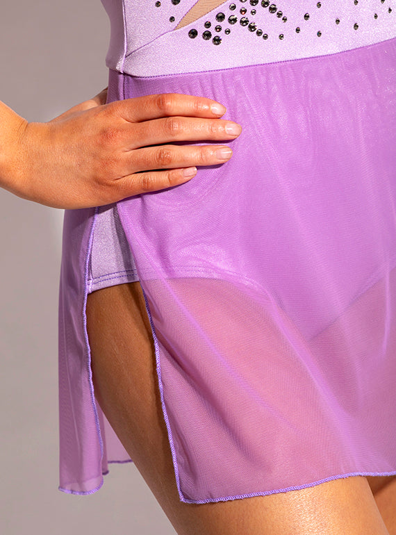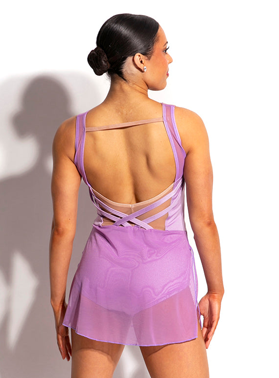 - Pretty dance dress with curved blocking, strappy back, and add on rhinestone pattern