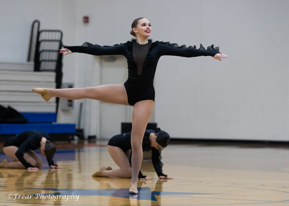- Latin inspired dance leotard with ruffles and a deep V neckline