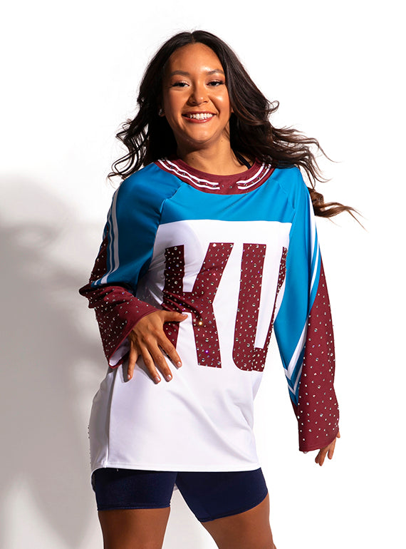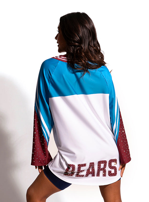 - Oversized hockey inspired jersey with sublimated blocking and add on rhinestones