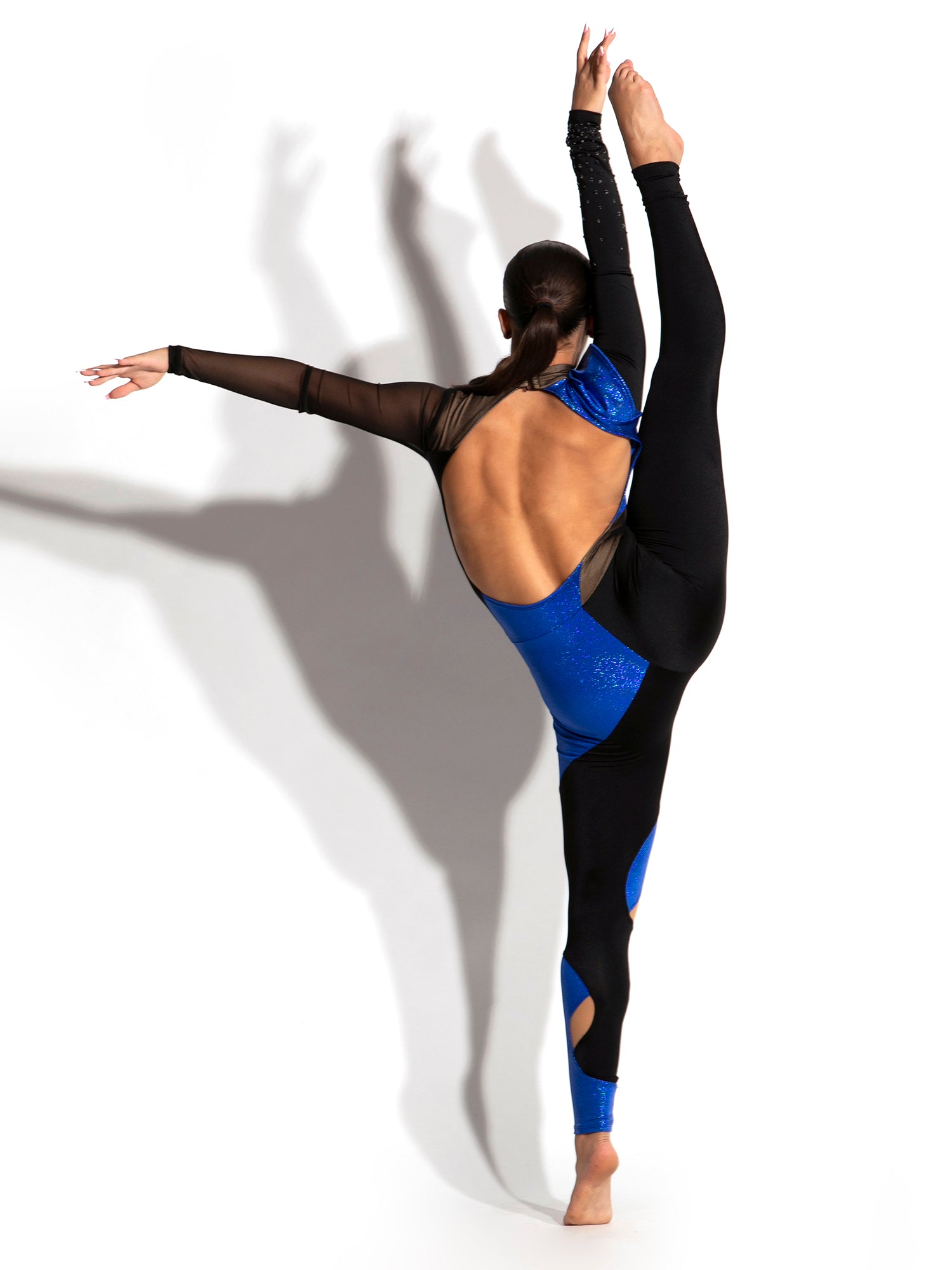 - Futuristic asymmetrical strong shoulder unitard with mesh blocking and add on rhinestones