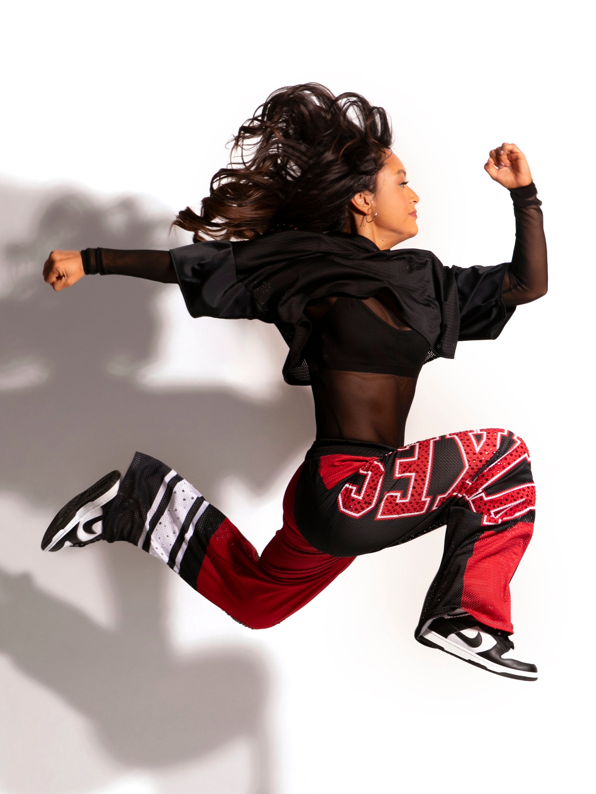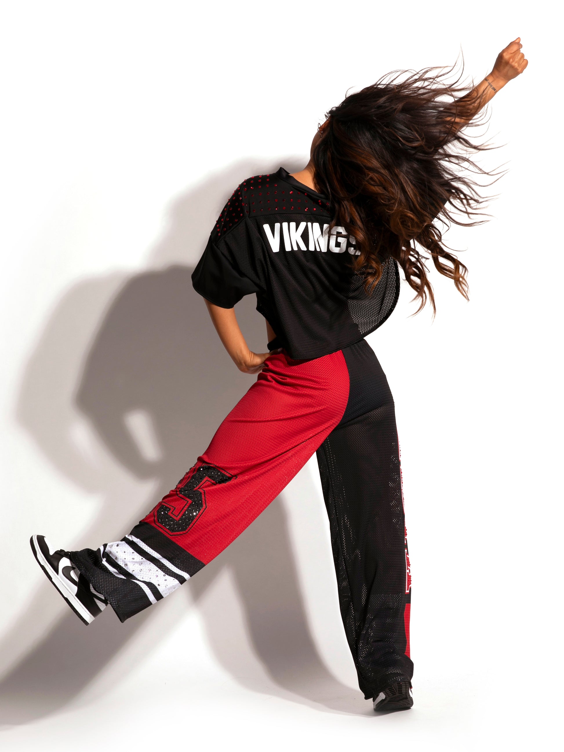 - Loose fit cropped jersey in athletic mesh fabric and add-on vinyl and rhinestone accents