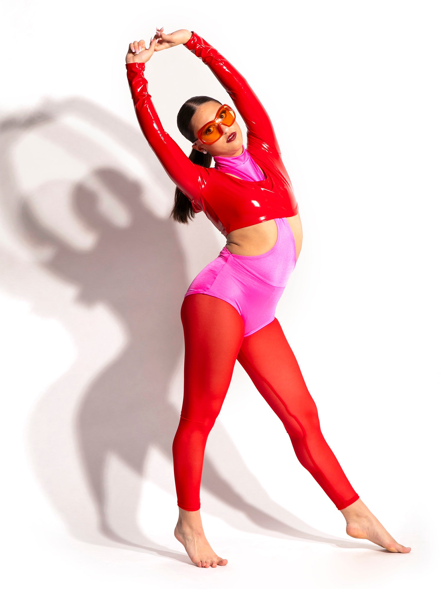 - Edgy long sleeve layered leotard with cutouts and mesh legs